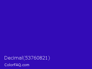 Decimal 53760821 Color is a normal indigo color and the nearest color is Interdimensional Blue #360ccc. Hex code #330bb7 and RGB value is rgb(51,11,183). In RGB color space, this color is composed of 20% red, 4% green, 72% blue, In CMYK color space, this color is composed of 72% cyan, 94% magenta, 0% yellow , 28% black , In HSL color space, this color has a hue angle of 254° , 89% saturation and 38% lightness.