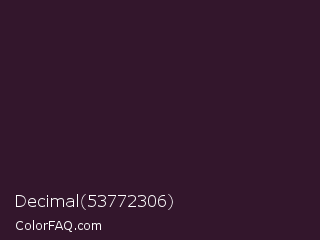 Decimal 53772306 Color is a very dark magenta color and the nearest color is Dark Purple #301934. Hex code #33162c and RGB value is rgb(51,22,44). In RGB color space, this color is composed of 20% red, 9% green, 17% blue, In CMYK color space, this color is composed of 0% cyan, 57% magenta, 14% yellow , 80% black , In HSL color space, this color has a hue angle of 314° , 40% saturation and 14% lightness.