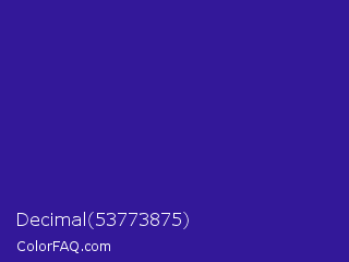 Decimal 53773875 Color is a normal indigo color and the nearest color is Blue Gem #2c0e8c. Hex code #331899 and RGB value is rgb(51,24,153). In RGB color space, this color is composed of 20% red, 9% green, 60% blue, In CMYK color space, this color is composed of 67% cyan, 84% magenta, 0% yellow , 40% black , In HSL color space, this color has a hue angle of 253° , 73% saturation and 35% lightness.