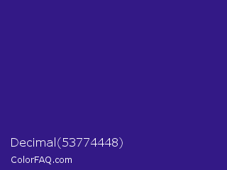 Decimal 53774448 Color is a normal indigo color and the nearest color is Pixie Powder #391285. Hex code #331986 and RGB value is rgb(51,25,134). In RGB color space, this color is composed of 20% red, 10% green, 53% blue, In CMYK color space, this color is composed of 62% cyan, 81% magenta, 0% yellow , 47% black , In HSL color space, this color has a hue angle of 254° , 69% saturation and 31% lightness.