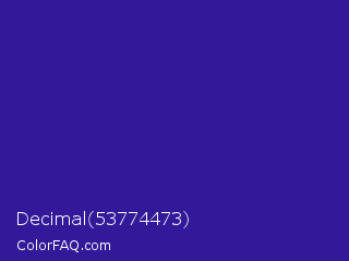Decimal 53774473 Color is a normal indigo color and the nearest color is Blue Gem #2c0e8c. Hex code #331999 and RGB value is rgb(51,25,153). In RGB color space, this color is composed of 20% red, 10% green, 60% blue, In CMYK color space, this color is composed of 67% cyan, 84% magenta, 0% yellow , 40% black , In HSL color space, this color has a hue angle of 252° , 72% saturation and 35% lightness.