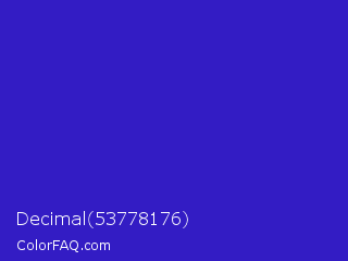 Decimal 53778176 Color is a normal indigo color and the nearest color is Interdimensional Blue #360ccc. Hex code #331cc4 and RGB value is rgb(51,28,196). In RGB color space, this color is composed of 20% red, 11% green, 77% blue, In CMYK color space, this color is composed of 74% cyan, 86% magenta, 0% yellow , 23% black , In HSL color space, this color has a hue angle of 248° , 75% saturation and 44% lightness.