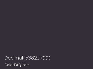 Decimal 53821799 Color is a very dark purple color and the nearest color is Blackcurrant #32293a. Hex code #332e37 and RGB value is rgb(51,46,55). In RGB color space, this color is composed of 20% red, 18% green, 22% blue, In CMYK color space, this color is composed of 7% cyan, 16% magenta, 0% yellow , 78% black , In HSL color space, this color has a hue angle of 273° , 9% saturation and 20% lightness.