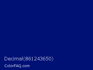 Decimal 861243650 Color is a dark blue color and the nearest color is Dark Imperial Blue #00147e. Hex code #001176 and RGB value is rgb(0,17,118). In RGB color space, this color is composed of 0% red, 7% green, 46% blue, In CMYK color space, this color is composed of 100% cyan, 86% magenta, 0% yellow , 54% black , In HSL color space, this color has a hue angle of 231° , 100% saturation and 23% lightness.