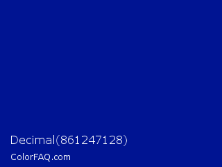 Decimal 861247128 Color is a dark blue color and the nearest color is Phthalo Blue #000f89. Hex code #001492 and RGB value is rgb(0,20,146). In RGB color space, this color is composed of 0% red, 8% green, 57% blue, In CMYK color space, this color is composed of 100% cyan, 86% magenta, 0% yellow , 43% black , In HSL color space, this color has a hue angle of 232° , 100% saturation and 29% lightness.