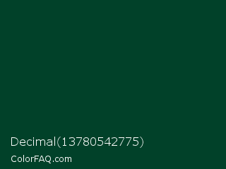 Decimal 13780542775 Color is a very dark green color and the nearest color is Sherwood Green #02402c. Hex code #014129 and RGB value is rgb(1,65,41). In RGB color space, this color is composed of 0% red, 25% green, 16% blue, In CMYK color space, this color is composed of 98% cyan, 0% magenta, 37% yellow , 75% black , In HSL color space, this color has a hue angle of 158° , 97% saturation and 13% lightness.