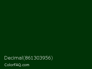 Decimal 861303956 Color is a very dark green color and the nearest color is Deep Fir #002900. Hex code #003306 and RGB value is rgb(0,51,6). In RGB color space, this color is composed of 0% red, 20% green, 2% blue, In CMYK color space, this color is composed of 100% cyan, 0% magenta, 88% yellow , 80% black , In HSL color space, this color has a hue angle of 127° , 100% saturation and 10% lightness.