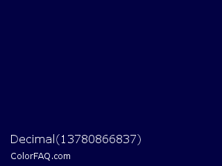 Decimal 13780866837 Color is a very dark indigo color and the nearest color is Stratos #000741. Hex code #020143 and RGB value is rgb(2,1,67). In RGB color space, this color is composed of 1% red, 0% green, 26% blue, In CMYK color space, this color is composed of 97% cyan, 99% magenta, 0% yellow , 74% black , In HSL color space, this color has a hue angle of 241° , 97% saturation and 13% lightness.