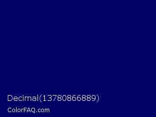 Decimal 13780866889 Color is a very dark indigo color and the nearest color is Arapawa #110c6c. Hex code #020165 and RGB value is rgb(2,1,101). In RGB color space, this color is composed of 1% red, 0% green, 40% blue, In CMYK color space, this color is composed of 98% cyan, 99% magenta, 0% yellow , 60% black , In HSL color space, this color has a hue angle of 241° , 98% saturation and 20% lightness.