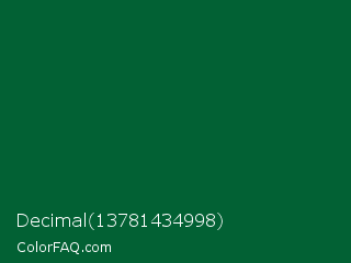 Decimal 13781434998 Color is a very dark green color and the nearest color is Cadmium Green #006b3c. Hex code #026134 and RGB value is rgb(2,97,52). In RGB color space, this color is composed of 1% red, 38% green, 20% blue, In CMYK color space, this color is composed of 98% cyan, 0% magenta, 46% yellow , 62% black , In HSL color space, this color has a hue angle of 152° , 96% saturation and 19% lightness.