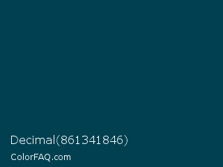 Decimal 861341846 Color is a very dark cyan color and the nearest color is Sherpa Blue #004950. Hex code #004050 and RGB value is rgb(0,64,80). In RGB color space, this color is composed of 0% red, 25% green, 31% blue, In CMYK color space, this color is composed of 100% cyan, 20% magenta, 0% yellow , 69% black , In HSL color space, this color has a hue angle of 192° , 100% saturation and 16% lightness.