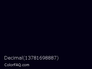 Decimal 13781698887 Color is a almost black indigo color and the nearest color is Jaguar #080110. Hex code #030013 and RGB value is rgb(3,0,19). In RGB color space, this color is composed of 1% red, 0% green, 7% blue, In CMYK color space, this color is composed of 84% cyan, 100% magenta, 0% yellow , 93% black , In HSL color space, this color has a hue angle of 249° , 100% saturation and 4% lightness.