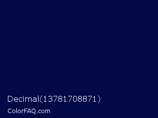 Decimal 13781708871 Color is a very dark blue color and the nearest color is Stratos #000741. Hex code #030847 and RGB value is rgb(3,8,71). In RGB color space, this color is composed of 1% red, 3% green, 28% blue, In CMYK color space, this color is composed of 96% cyan, 89% magenta, 0% yellow , 72% black , In HSL color space, this color has a hue angle of 236° , 92% saturation and 15% lightness.