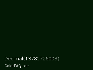 Decimal 13781726003 Color is a almost black green color and the nearest color is Midnight Moss #041004. Hex code #031905 and RGB value is rgb(3,25,5). In RGB color space, this color is composed of 1% red, 10% green, 2% blue, In CMYK color space, this color is composed of 88% cyan, 0% magenta, 80% yellow , 90% black , In HSL color space, this color has a hue angle of 125° , 79% saturation and 5% lightness.