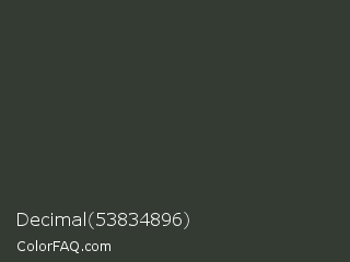 Decimal 53834896 Color is a very dark green color and the nearest color is Tuatara #363534. Hex code #333b32 and RGB value is rgb(51,59,50). In RGB color space, this color is composed of 20% red, 23% green, 20% blue, In CMYK color space, this color is composed of 14% cyan, 0% magenta, 15% yellow , 77% black , In HSL color space, this color has a hue angle of 113° , 8% saturation and 21% lightness.