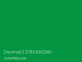 Decimal 13781930296 Color is a dark green color and the nearest color is Spanish Green #009150. Hex code #039542 and RGB value is rgb(3,149,66). In RGB color space, this color is composed of 1% red, 58% green, 26% blue, In CMYK color space, this color is composed of 98% cyan, 0% magenta, 56% yellow , 42% black , In HSL color space, this color has a hue angle of 146° , 96% saturation and 30% lightness.