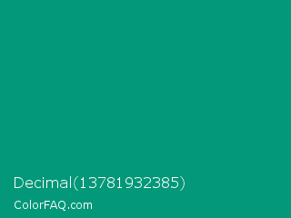 Decimal 13781932385 Color is a dark cyan color and the nearest color is Paolo Veronese Green #009b7d. Hex code #039879 and RGB value is rgb(3,152,121). In RGB color space, this color is composed of 1% red, 60% green, 47% blue, In CMYK color space, this color is composed of 98% cyan, 0% magenta, 20% yellow , 40% black , In HSL color space, this color has a hue angle of 168° , 96% saturation and 30% lightness.