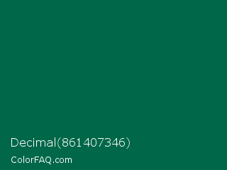 Decimal 861407346 Color is a very dark green color and the nearest color is Bottle Green #006a4e. Hex code #006748 and RGB value is rgb(0,103,72). In RGB color space, this color is composed of 0% red, 40% green, 28% blue, In CMYK color space, this color is composed of 100% cyan, 0% magenta, 30% yellow , 60% black , In HSL color space, this color has a hue angle of 162° , 100% saturation and 20% lightness.