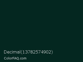 Decimal 13782574902 Color is a almost black cyan color and the nearest color is Burnham #002e20. Hex code #042820 and RGB value is rgb(4,40,32). In RGB color space, this color is composed of 2% red, 16% green, 13% blue, In CMYK color space, this color is composed of 90% cyan, 0% magenta, 20% yellow , 84% black , In HSL color space, this color has a hue angle of 167° , 82% saturation and 9% lightness.