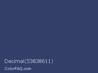 Decimal 53838611 Color is a normal blue color and the nearest color is Rhino #2e3f62. Hex code #333e69 and RGB value is rgb(51,62,105). In RGB color space, this color is composed of 20% red, 24% green, 41% blue, In CMYK color space, this color is composed of 51% cyan, 41% magenta, 0% yellow , 59% black , In HSL color space, this color has a hue angle of 228° , 35% saturation and 31% lightness.
