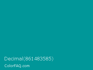 Decimal 861483585 Color is a dark cyan color and the nearest color is Viridian Green #009698. Hex code #009799 and RGB value is rgb(0,151,153). In RGB color space, this color is composed of 0% red, 59% green, 60% blue, In CMYK color space, this color is composed of 100% cyan, 1% magenta, 0% yellow , 40% black , In HSL color space, this color has a hue angle of 181° , 100% saturation and 30% lightness.