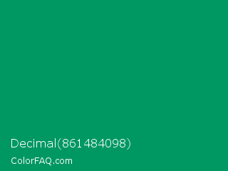 Decimal 861484098 Color is a dark green color and the nearest color is Green Cyan #009966. Hex code #009862 and RGB value is rgb(0,152,98). In RGB color space, this color is composed of 0% red, 60% green, 38% blue, In CMYK color space, this color is composed of 100% cyan, 0% magenta, 36% yellow , 40% black , In HSL color space, this color has a hue angle of 159° , 100% saturation and 30% lightness.