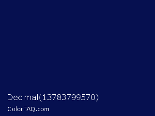 Decimal 13783799570 Color is a very dark blue color and the nearest color is Gulf Blue #051657. Hex code #061050 and RGB value is rgb(6,16,80). In RGB color space, this color is composed of 2% red, 6% green, 31% blue, In CMYK color space, this color is composed of 93% cyan, 80% magenta, 0% yellow , 69% black , In HSL color space, this color has a hue angle of 232° , 86% saturation and 17% lightness.