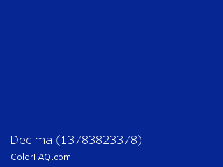 Decimal 13783823378 Color is a dark blue color and the nearest color is Imperial Blue #002395. Hex code #062694 and RGB value is rgb(6,38,148). In RGB color space, this color is composed of 2% red, 15% green, 58% blue, In CMYK color space, this color is composed of 96% cyan, 74% magenta, 0% yellow , 42% black , In HSL color space, this color has a hue angle of 226° , 92% saturation and 30% lightness.