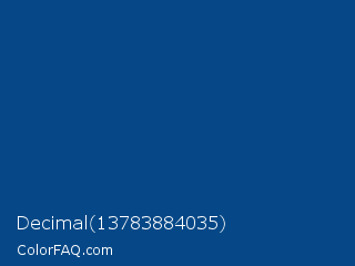 Decimal 13783884035 Color is a dark blue color and the nearest color is Congress Blue #02478e. Hex code #064887 and RGB value is rgb(6,72,135). In RGB color space, this color is composed of 2% red, 28% green, 53% blue, In CMYK color space, this color is composed of 96% cyan, 47% magenta, 0% yellow , 47% black , In HSL color space, this color has a hue angle of 209° , 91% saturation and 28% lightness.