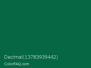 Decimal 13783939442 Color is a very dark green color and the nearest color is Cadmium Green #006b3c. Hex code #066744 and RGB value is rgb(6,103,68). In RGB color space, this color is composed of 2% red, 40% green, 27% blue, In CMYK color space, this color is composed of 94% cyan, 0% magenta, 34% yellow , 60% black , In HSL color space, this color has a hue angle of 158° , 89% saturation and 21% lightness.