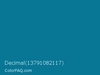 Decimal 13791082117 Color is a normal cyan color and the nearest color is Metallic Seaweed #0a7e8c. Hex code #077795 and RGB value is rgb(7,119,149). In RGB color space, this color is composed of 3% red, 47% green, 58% blue, In CMYK color space, this color is composed of 95% cyan, 20% magenta, 0% yellow , 42% black , In HSL color space, this color has a hue angle of 193° , 91% saturation and 31% lightness.