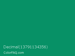 Decimal 13791134356 Color is a dark green color and the nearest color is Green Cyan #009966. Hex code #079166 and RGB value is rgb(7,145,102). In RGB color space, this color is composed of 3% red, 57% green, 40% blue, In CMYK color space, this color is composed of 95% cyan, 0% magenta, 30% yellow , 43% black , In HSL color space, this color has a hue angle of 161° , 91% saturation and 30% lightness.