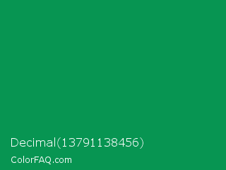 Decimal 13791138456 Color is a normal green color and the nearest color is Spanish Green #009150. Hex code #079552 and RGB value is rgb(7,149,82). In RGB color space, this color is composed of 3% red, 58% green, 32% blue, In CMYK color space, this color is composed of 95% cyan, 0% magenta, 45% yellow , 42% black , In HSL color space, this color has a hue angle of 152° , 91% saturation and 31% lightness.