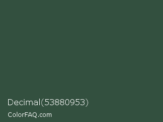 Decimal 53880953 Color is a dark green color and the nearest color is Lunar Green #3c493a. Hex code #33503f and RGB value is rgb(51,80,63). In RGB color space, this color is composed of 20% red, 31% green, 25% blue, In CMYK color space, this color is composed of 36% cyan, 0% magenta, 21% yellow , 69% black , In HSL color space, this color has a hue angle of 145° , 22% saturation and 26% lightness.