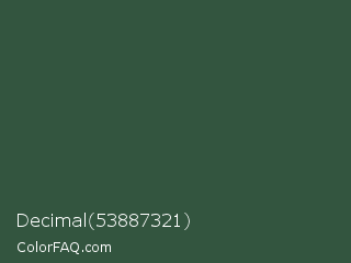 Decimal 53887321 Color is a dark green color and the nearest color is Hunter Green #355e3b. Hex code #33553f and RGB value is rgb(51,85,63). In RGB color space, this color is composed of 20% red, 33% green, 25% blue, In CMYK color space, this color is composed of 40% cyan, 0% magenta, 26% yellow , 67% black , In HSL color space, this color has a hue angle of 141° , 25% saturation and 27% lightness.