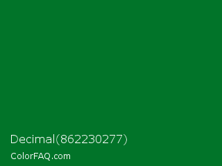 Decimal 862230277 Color is a dark green color and the nearest color is La Salle Green #087830. Hex code #017429 and RGB value is rgb(1,116,41). In RGB color space, this color is composed of 0% red, 45% green, 16% blue, In CMYK color space, this color is composed of 99% cyan, 0% magenta, 65% yellow , 55% black , In HSL color space, this color has a hue angle of 141° , 98% saturation and 23% lightness.