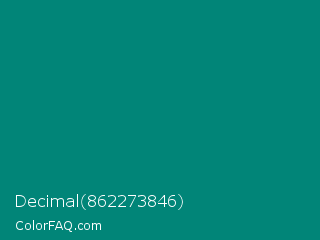 Decimal 862273846 Color is a dark cyan color and the nearest color is Teal Green #00827f. Hex code #018578 and RGB value is rgb(1,133,120). In RGB color space, this color is composed of 0% red, 52% green, 47% blue, In CMYK color space, this color is composed of 99% cyan, 0% magenta, 10% yellow , 48% black , In HSL color space, this color has a hue angle of 174° , 99% saturation and 26% lightness.