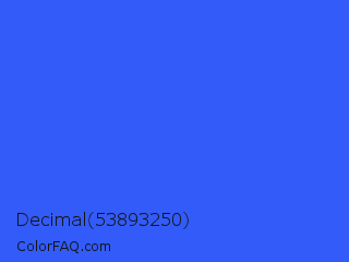 Decimal 53893250 Color is a normal blue color and the nearest color is Ultramarine Blue #4166f5. Hex code #335bfa and RGB value is rgb(51,91,250). In RGB color space, this color is composed of 20% red, 36% green, 98% blue, In CMYK color space, this color is composed of 80% cyan, 64% magenta, 0% yellow , 2% black , In HSL color space, this color has a hue angle of 228° , 95% saturation and 59% lightness.