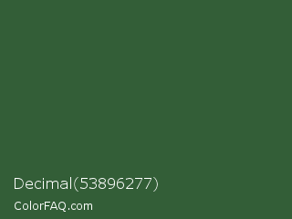 Decimal 53896277 Color is a dark green color and the nearest color is Hunter Green #355e3b. Hex code #335e37 and RGB value is rgb(51,94,55). In RGB color space, this color is composed of 20% red, 37% green, 22% blue, In CMYK color space, this color is composed of 46% cyan, 0% magenta, 41% yellow , 63% black , In HSL color space, this color has a hue angle of 126° , 30% saturation and 28% lightness.