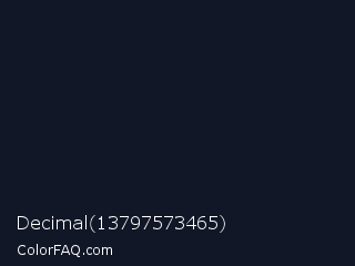 Decimal 13797573465 Color is a very dark blue color and the nearest color is Mirage #161928. Hex code #111727 and RGB value is rgb(17,23,39). In RGB color space, this color is composed of 7% red, 9% green, 15% blue, In CMYK color space, this color is composed of 56% cyan, 41% magenta, 0% yellow , 85% black , In HSL color space, this color has a hue angle of 224° , 39% saturation and 11% lightness.
