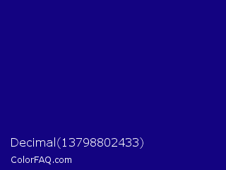 Decimal 13798802433 Color is a dark indigo color and the nearest color is Ultramarine #120a8f. Hex code #130381 and RGB value is rgb(19,3,129). In RGB color space, this color is composed of 7% red, 1% green, 51% blue, In CMYK color space, this color is composed of 85% cyan, 98% magenta, 0% yellow , 49% black , In HSL color space, this color has a hue angle of 248° , 95% saturation and 26% lightness.