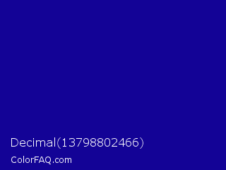Decimal 13798802466 Color is a dark indigo color and the nearest color is Ultramarine #120a8f. Hex code #130396 and RGB value is rgb(19,3,150). In RGB color space, this color is composed of 7% red, 1% green, 59% blue, In CMYK color space, this color is composed of 87% cyan, 98% magenta, 0% yellow , 41% black , In HSL color space, this color has a hue angle of 247° , 96% saturation and 30% lightness.