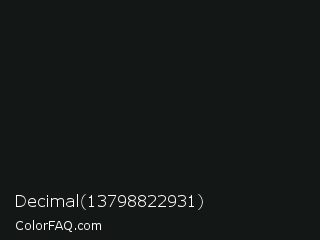 Decimal 13798822931 Color is a almost black green color and the nearest color is Racing Green #0c1911. Hex code #131715 and RGB value is rgb(19,23,21). In RGB color space, this color is composed of 7% red, 9% green, 8% blue, In CMYK color space, this color is composed of 17% cyan, 0% magenta, 9% yellow , 91% black , In HSL color space, this color has a hue angle of 150° , 10% saturation and 8% lightness.