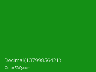 Decimal 13799856421 Color is a normal green color and the nearest color is India Green #138808. Hex code #149015 and RGB value is rgb(20,144,21). In RGB color space, this color is composed of 8% red, 56% green, 8% blue, In CMYK color space, this color is composed of 86% cyan, 0% magenta, 85% yellow , 44% black , In HSL color space, this color has a hue angle of 120° , 76% saturation and 32% lightness.