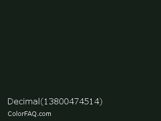 Decimal 13800474514 Color is a very dark green color and the nearest color is Eerie Black #1b1b1b. Hex code #152018 and RGB value is rgb(21,32,24). In RGB color space, this color is composed of 8% red, 13% green, 9% blue, In CMYK color space, this color is composed of 34% cyan, 0% magenta, 25% yellow , 87% black , In HSL color space, this color has a hue angle of 136° , 21% saturation and 10% lightness.
