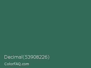 Decimal 53908226 Color is a normal green color and the nearest color is Stromboli #325d52. Hex code #336956 and RGB value is rgb(51,105,86). In RGB color space, this color is composed of 20% red, 41% green, 34% blue, In CMYK color space, this color is composed of 51% cyan, 0% magenta, 18% yellow , 59% black , In HSL color space, this color has a hue angle of 159° , 35% saturation and 31% lightness.