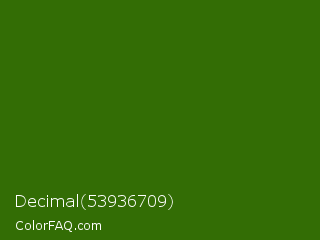 Decimal 53936709 Color is a very dark green color and the nearest color is Dell #396413. Hex code #336d05 and RGB value is rgb(51,109,5). In RGB color space, this color is composed of 20% red, 43% green, 2% blue, In CMYK color space, this color is composed of 53% cyan, 0% magenta, 95% yellow , 57% black , In HSL color space, this color has a hue angle of 93° , 91% saturation and 22% lightness.