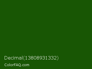 Decimal 13808931332 Color is a very dark green color and the nearest color is Lincoln Green #195905. Hex code #185604 and RGB value is rgb(24,86,4). In RGB color space, this color is composed of 9% red, 34% green, 2% blue, In CMYK color space, this color is composed of 72% cyan, 0% magenta, 95% yellow , 66% black , In HSL color space, this color has a hue angle of 105° , 91% saturation and 18% lightness.