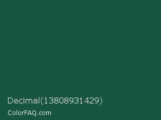 Decimal 13808931429 Color is a very dark green color and the nearest color is Brunswick Green #1b4d3e. Hex code #185641 and RGB value is rgb(24,86,65). In RGB color space, this color is composed of 9% red, 34% green, 25% blue, In CMYK color space, this color is composed of 72% cyan, 0% magenta, 24% yellow , 66% black , In HSL color space, this color has a hue angle of 160° , 56% saturation and 22% lightness.