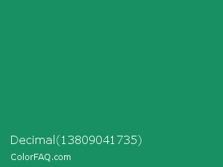 Decimal 13809041735 Color is a normal green color and the nearest color is Eucalyptus #278a5b. Hex code #189063 and RGB value is rgb(24,144,99). In RGB color space, this color is composed of 9% red, 56% green, 39% blue, In CMYK color space, this color is composed of 83% cyan, 0% magenta, 31% yellow , 44% black , In HSL color space, this color has a hue angle of 158° , 71% saturation and 33% lightness.